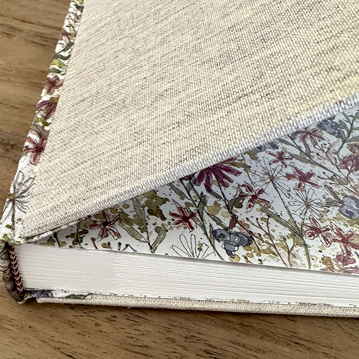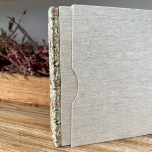 Nuestros álbumes de fotos artesanales son muy especiales. Están hechos a mano con telas de lino combinadas. Los lomos y las guardas están llenas de flores, con nuestro estampado Garbader.