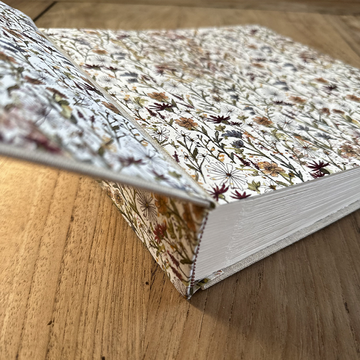 Nuestros álbumes de fotos artesanales son muy especiales. Están hechos a mano con telas de lino combinadas. Los lomos y las guardas están llenas de flores, con nuestro estampado Kevätt.