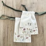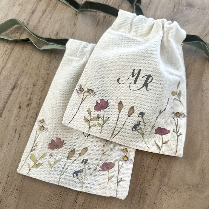 Bolsita llena de flores del estampado Cosmos para transportar vuestras alianzas hasta el altar. Se cierran con un lazo de terciopelo, y por dentro tienen otro para asegurar las alianzas.