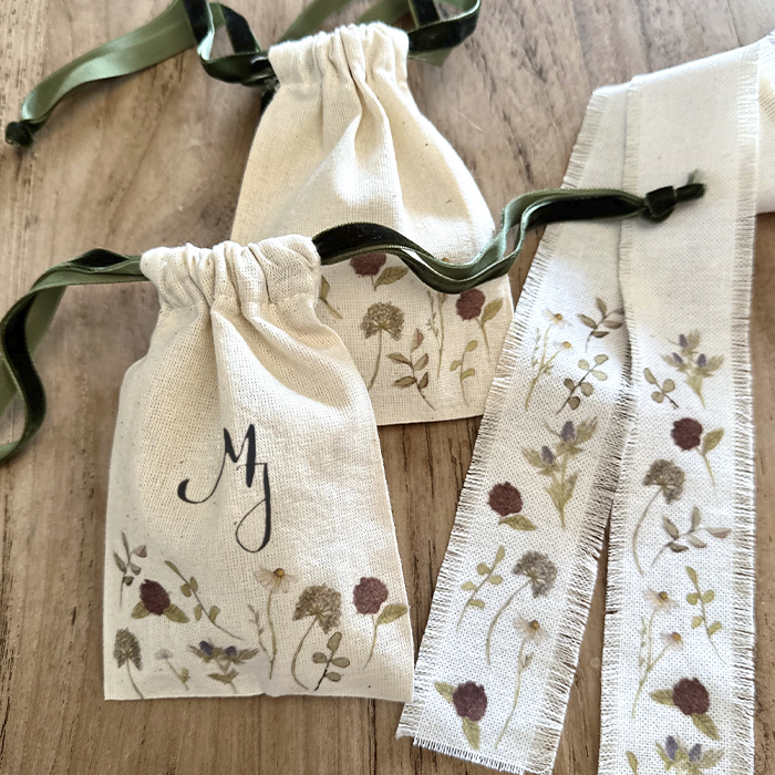 Bolsita llena de flores del estampado Eryngium para transportar vuestras alianzas hasta el altar. Se cierran con un lazo de terciopelo, y por dentro tienen otro para asegurar las alianzas.