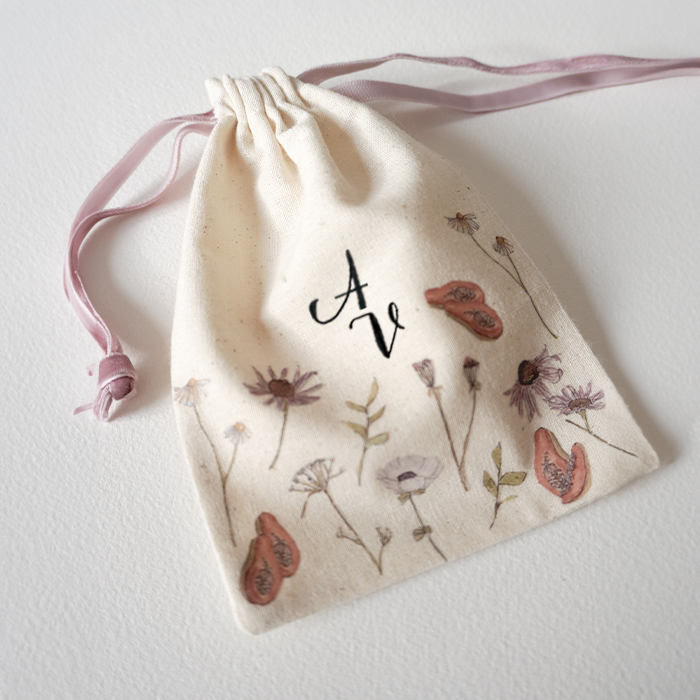 Bolsita llena de flores del estampado Gedänt para transportar vuestras alianzas hasta el altar. Se cierran con un lazo de terciopelo, y por dentro tienen otro para asegurar las alianzas.
