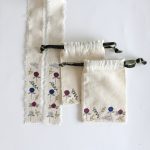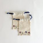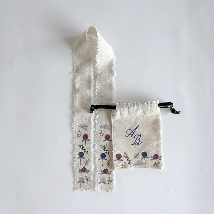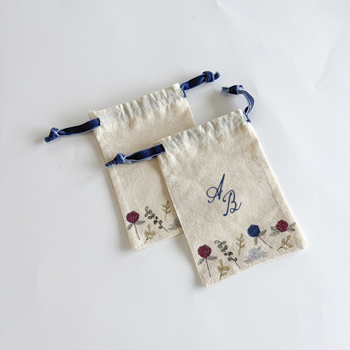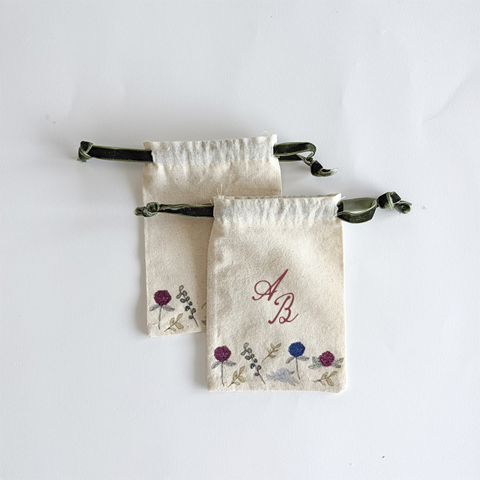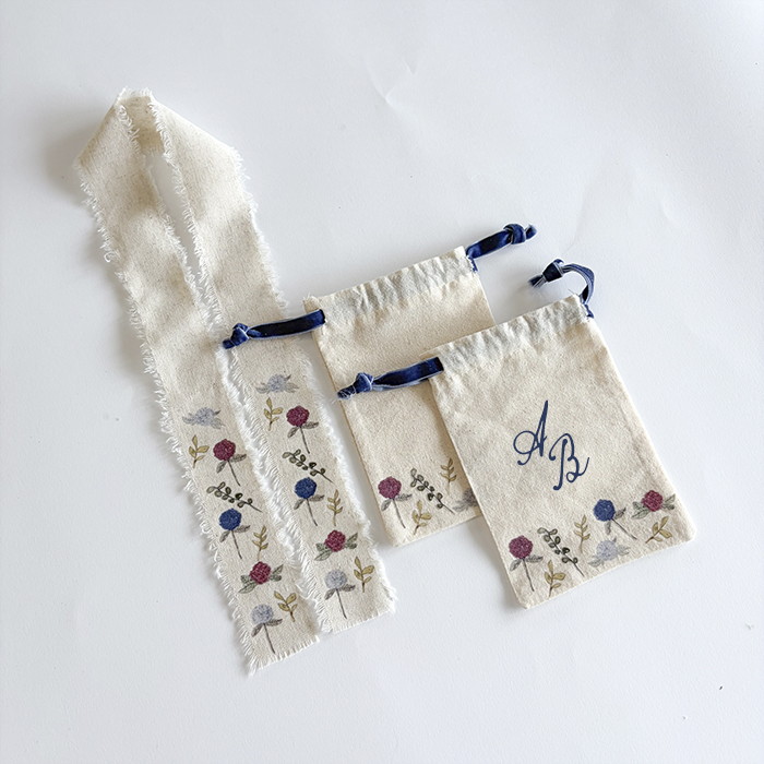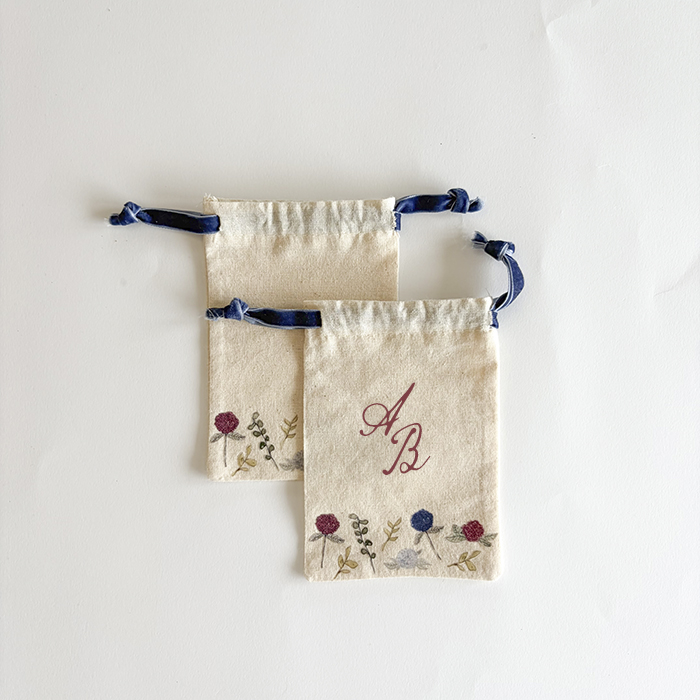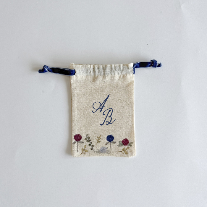 Bolsita llena de flores del estampado Muy de Cantabria para transportar vuestras alianzas hasta el altar. Se cierran con un lazo de terciopelo, y por dentro tienen otro para asegurar las alianzas.