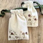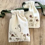 Bolsitas con flores del estampado Eryngium para llevar las arras, que se cierra con un lazo de terciopelo. Personalizadas a juego de vuestras invitaciones o con el estampado de flores que más te apetezca.