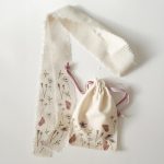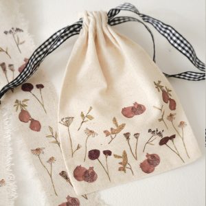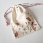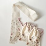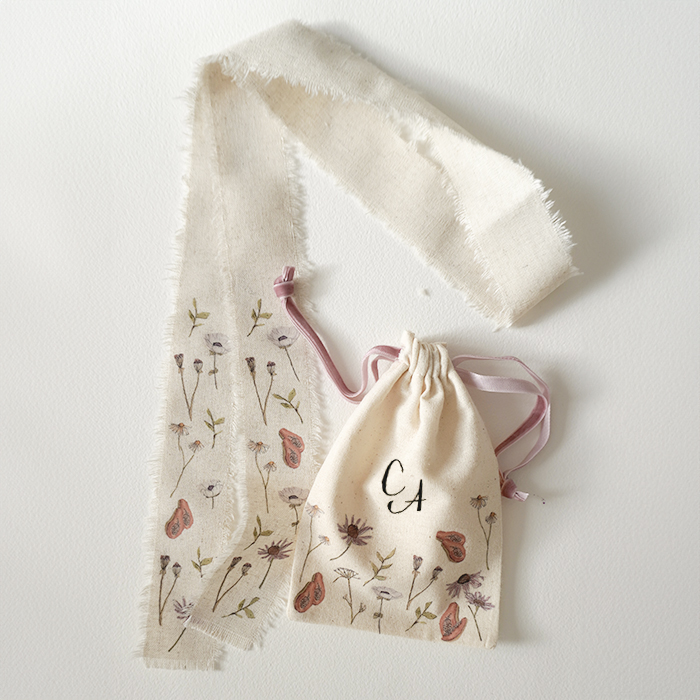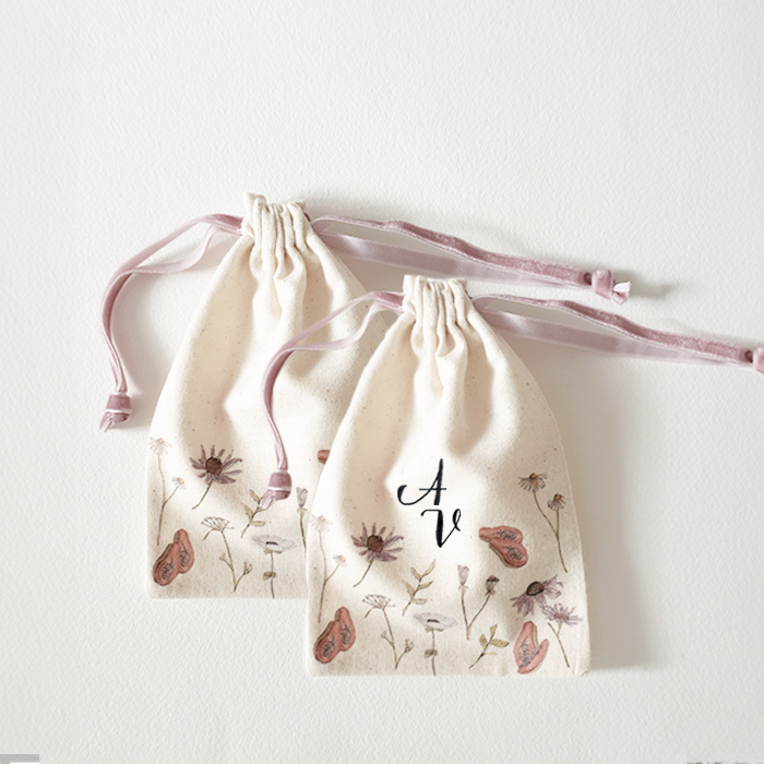 Bolsitas con flores del estampado Gedänt para llevar las arras, que se cierra con un lazo de terciopelo. Personalizadas a juego de vuestras invitaciones o con el estampado de flores que más te apetezca.