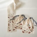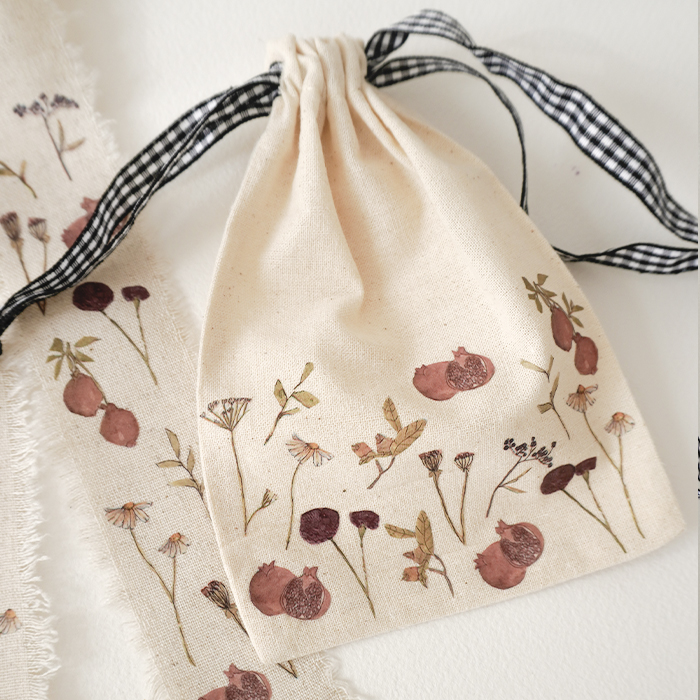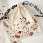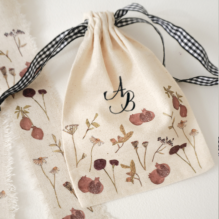 Bolsitas con flores del estampado Granatt para llevar las arras, que se cierra con un lazo de terciopelo. Personalizadas a juego de vuestras invitaciones o con el estampado de flores que más te apetezca.