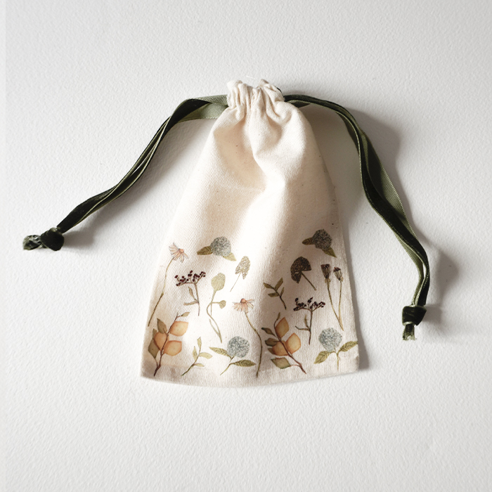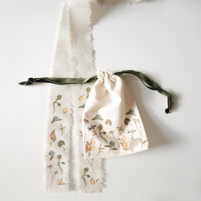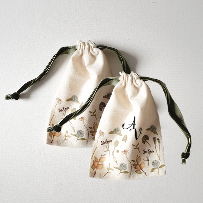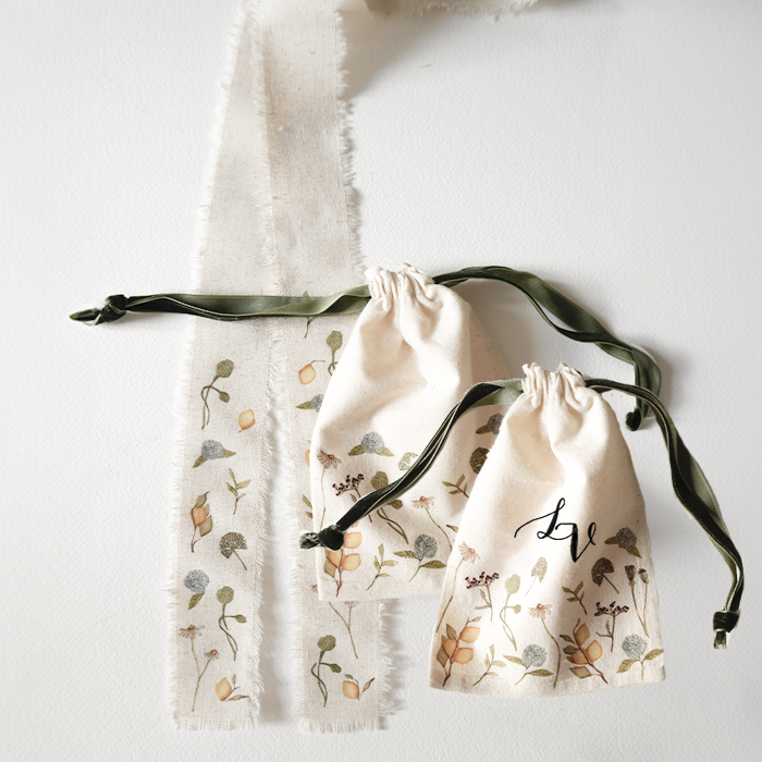 Bolsitas con flores del estampado Lemon para llevar las arras, que se cierra con un lazo de terciopelo. Personalizadas a juego de vuestras invitaciones o con el estampado de flores que más te apetezca.