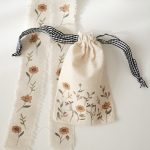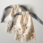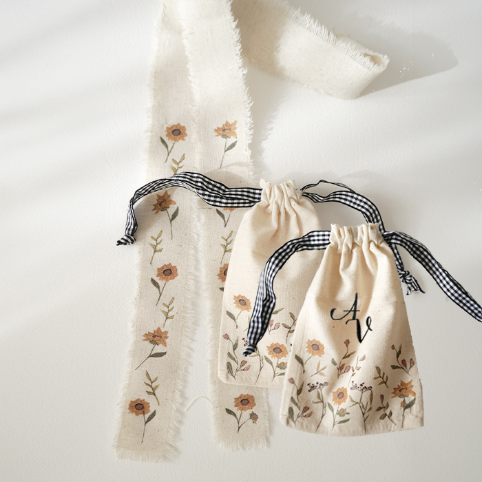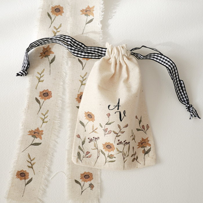 Bolsitas con flores del estampado Solsikker para llevar las arras, que se cierra con un lazo de terciopelo. Personalizadas a juego de vuestras invitaciones o con el estampado de flores que más te apetezca.
