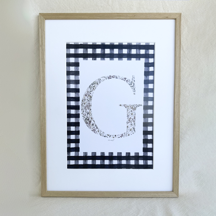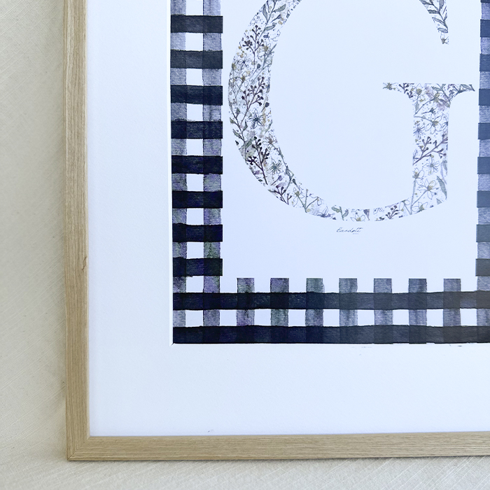 Delicada reproducción digital de nuestras icónicas iniciales de flores en tonos burdeos con paspartú vichy.