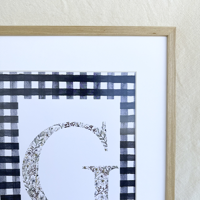Delicada reproducción digital de nuestras icónicas iniciales de flores en tonos burdeos con paspartú vichy. Ideales para decorar cualquier rincón del hogar.
