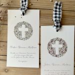 Nuestros recordatorios son muy especiales. Mezclan una tradición renovada. Están ilustrados con nuestra Cruz, creada completamente a partir de flores. creada completamente a partir de flores. Van caligrafiados y los estampados florales pueden presentarse en tonos rosados o azulados. El lazo vichy va incluido.