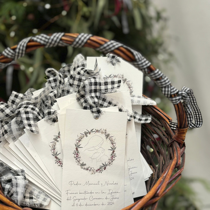 Nuestros recordatorios navideños más especiales, mezclando una tradición renovada. Están ilustrados con la silueta de la Virgen niña con una corona navideña, creada completamente a partir de flores. El lazo va incluido.