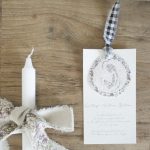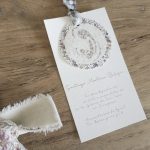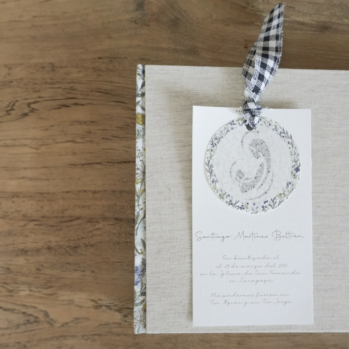 Nuestros recordatorios son muy especiales y mezclan una tradición renovada. Están ilustrados con la silueta de la Virgen niña con un marco redondo creada completamente por flores. Van caligrafiados y los estampados florales pueden presentarse en tonos rosados o azulados. El lazo vichy va incluido.
