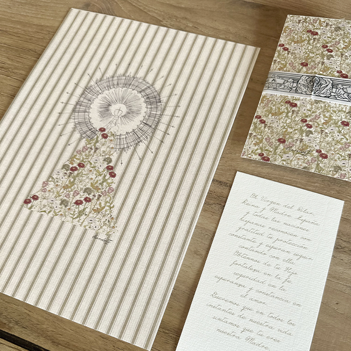 Replica de nuestra icónica Virgen del Pilar es una delicada reproducción de nuestra acuarela de la Virgen del Pilar, hecha a mano, con el manto repleto de flores y rayas verde olivo. Es ideal para decorar cualquier rincón del hogar.