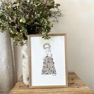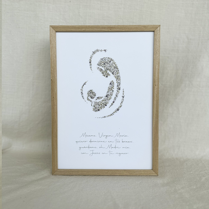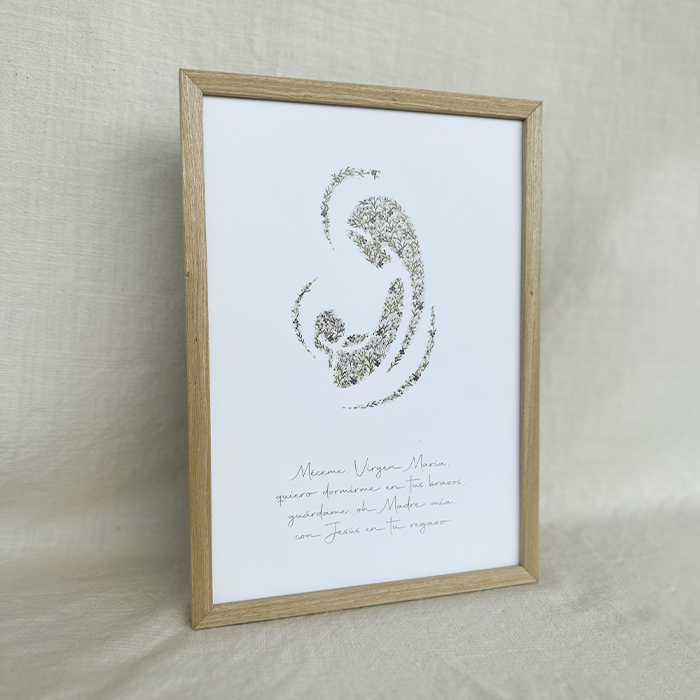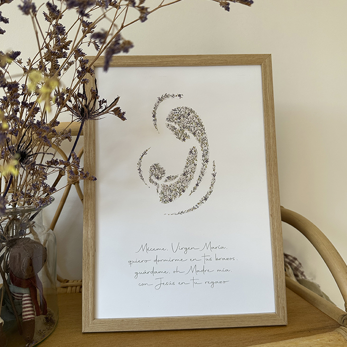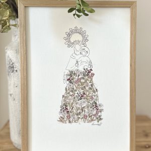 La Lámina de la oración de La Virgen Niña es una delicada reproducción de nuestra acuarela de la Virgen Niña, hecha a mano, de líneas minimalistas y llenita de flores del estampado Garbaderblue. Ideal para decorar cualquier rincón del hogar, incluido dormitorios infantiles.