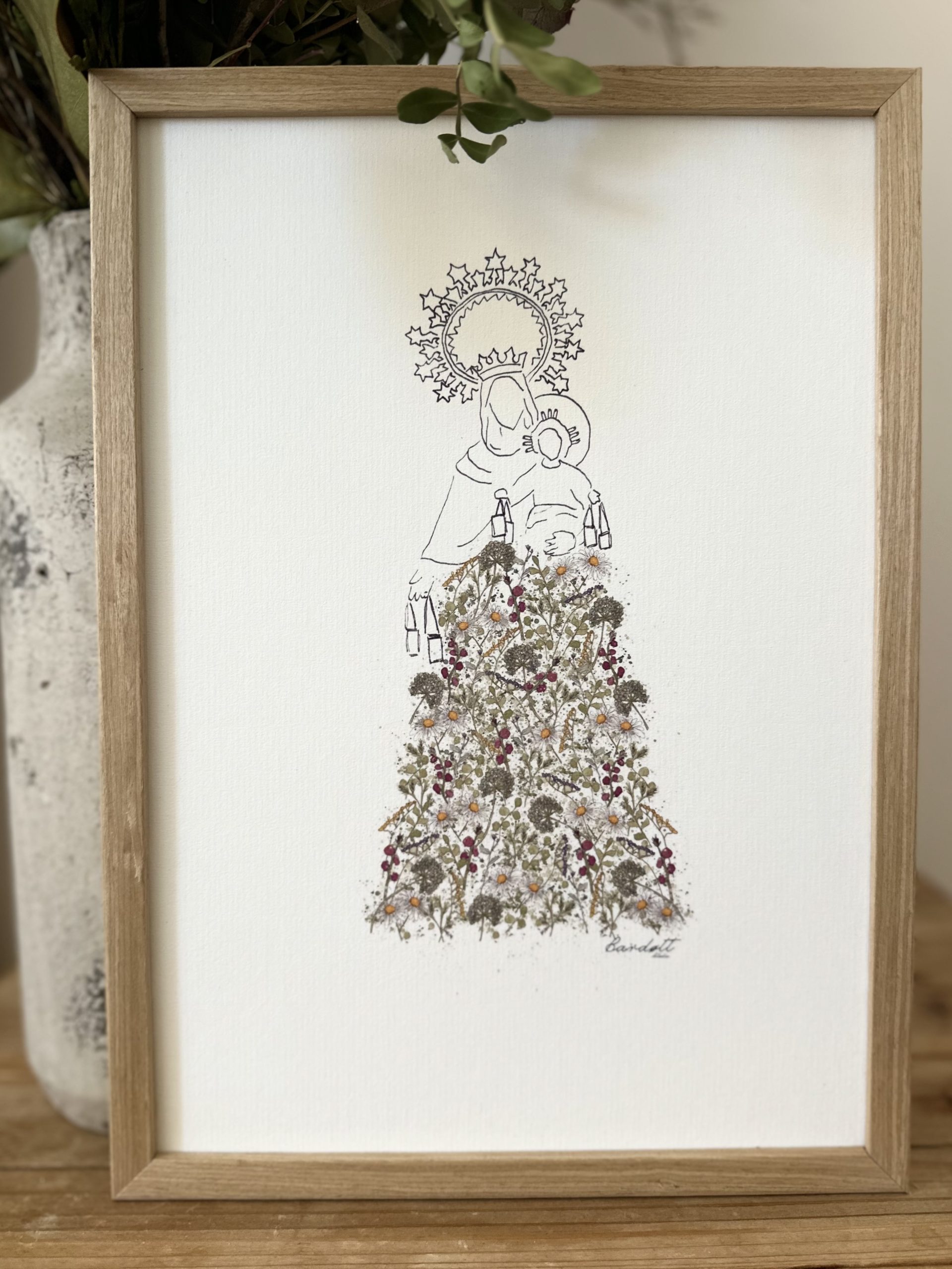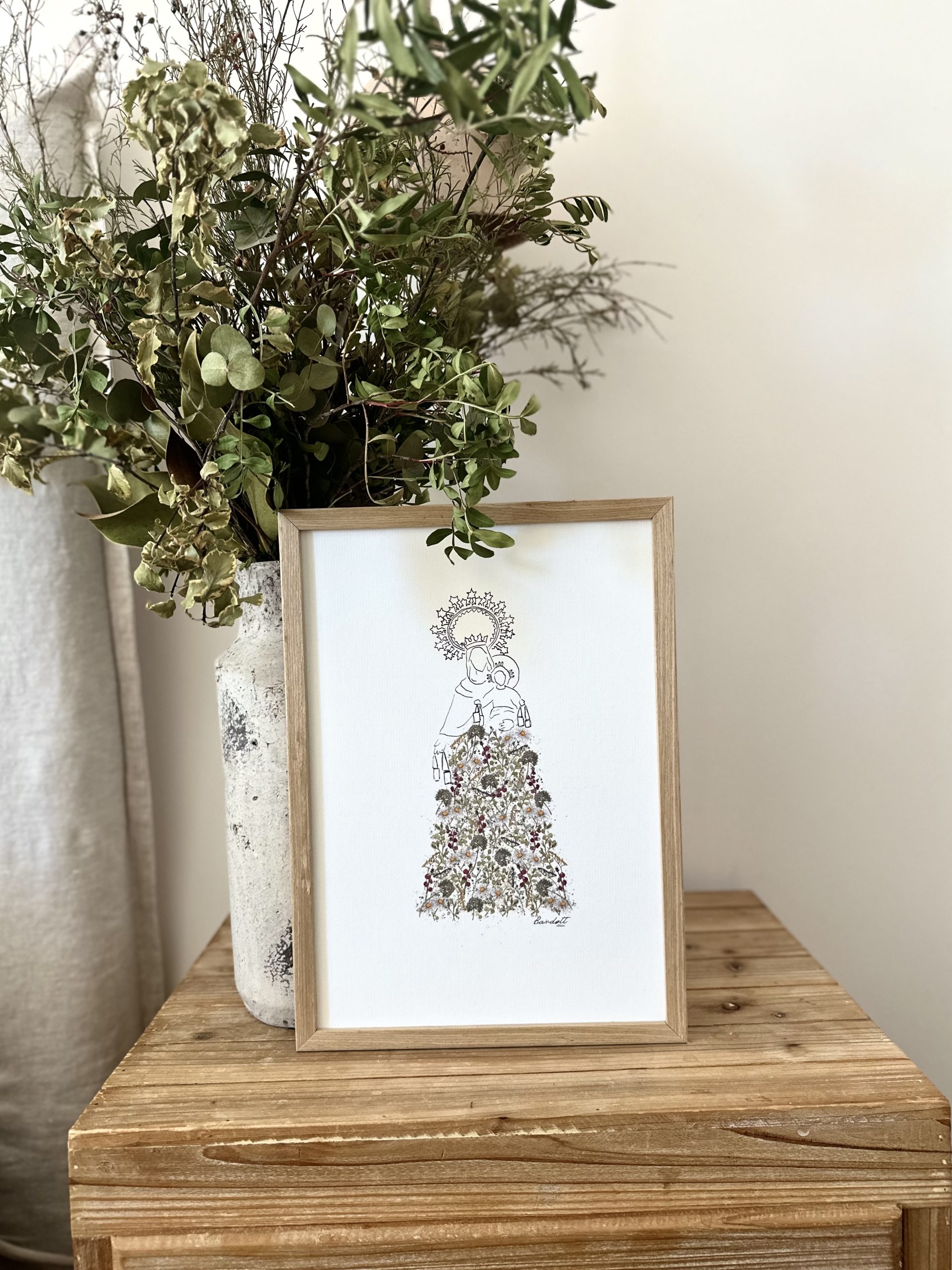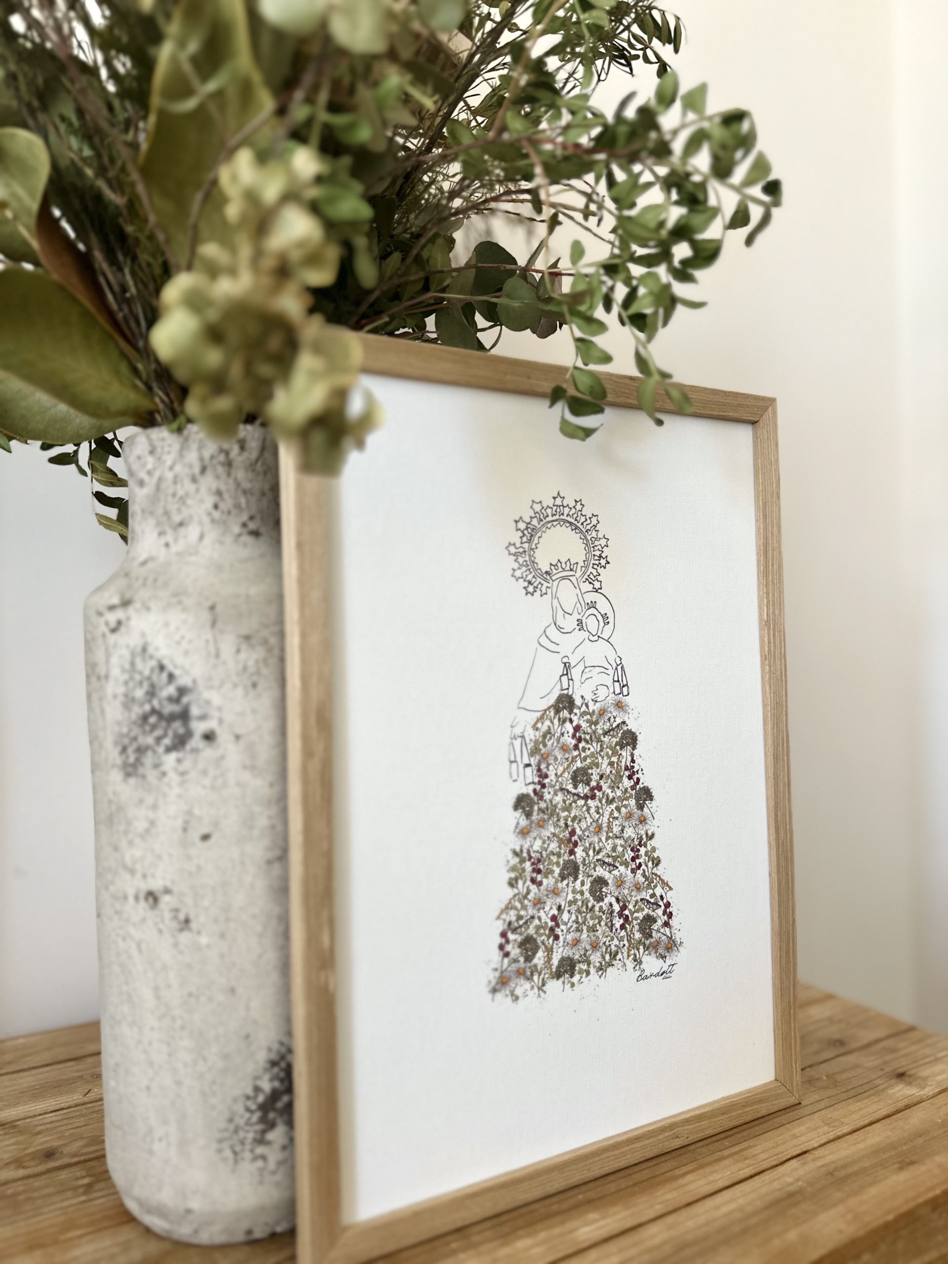 La lámina Virgen del Carmen es una delicada reproducción de nuestra acuarela de la Virgen del Carmen,  hecha a mano, con el manto repleto de flores del estampado Blossom. Es ideal para decorar cualquier rincón del hogar.