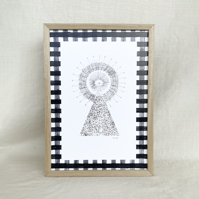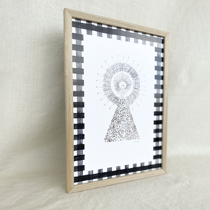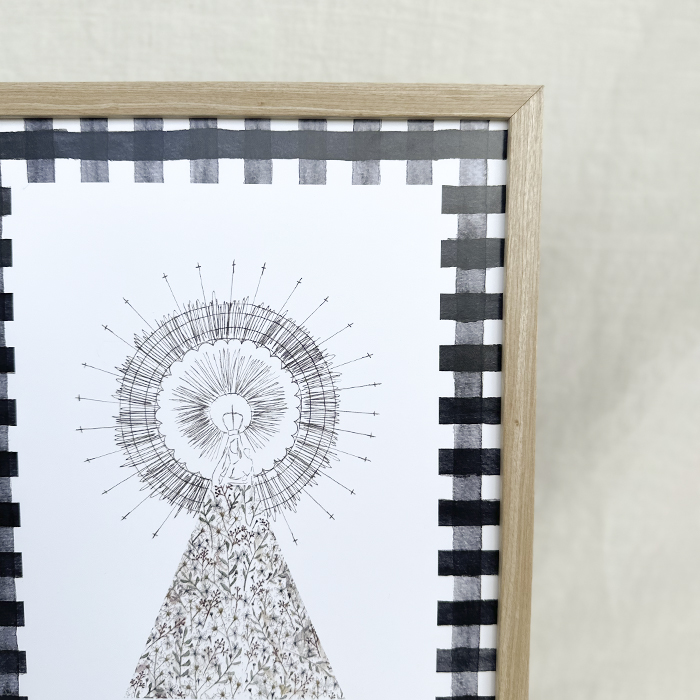 Nuestra icónica Virgen del Pilar es una delicada reproducción de nuestra acuarela de la Virgen del Pilar, hecha a mano, con el manto repleto de flores del estampado Høsten y paspartú vichy. Es ideal para decorar cualquier rincón del hogar.